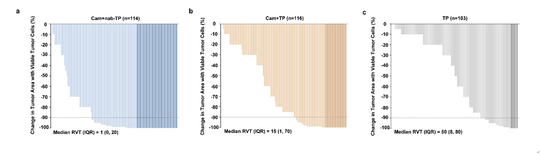 此外,A组(卡瑞利珠单抗+nab-TP)和B组(卡瑞利珠单抗+TP)新辅助治疗后病理分期(ypTNM)为I期的患者比例比C组(TP)更高(50.9% vs 39.7% vs 26.2%);三组的原发灶中位残留活肿瘤细胞(RVT)分别为1%、15%和50%,表明卡瑞利珠单抗联合化疗在减少术后残留、提高患者预后方面有极大潜力。